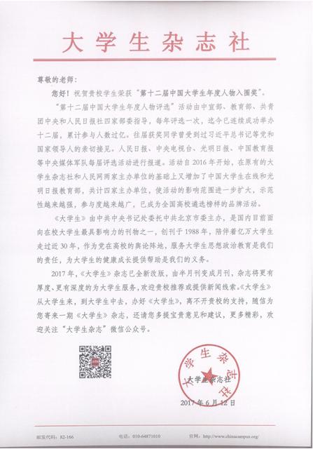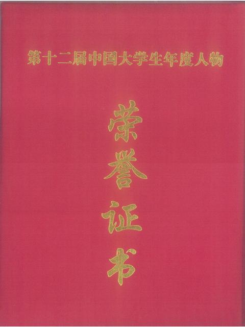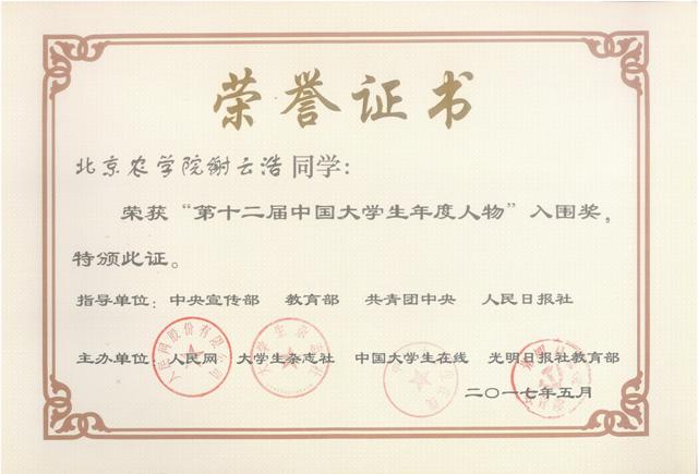 2012级动物医学专业谢云浩同学荣获“第十二届中国大学生年度人物”入围奖荣誉称号。