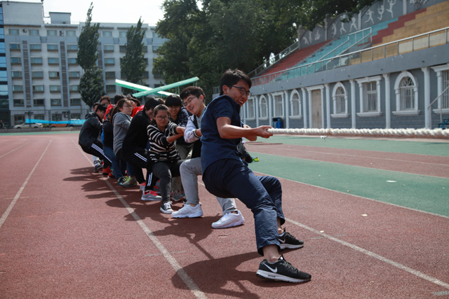 2016级新生在操场主席台下举办了拔河比赛。