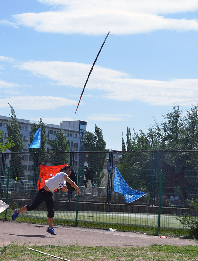 的运动健儿们用手中的标枪向距离的权限发起一次又一次的挑战,标枪在空中轻盈的姿态是健儿们枪击案的力量和熟练的技巧的体现。场下观众们也不断地加油呐喊,激励着场内的运动员们。准备、助跑、投掷,一道道优美的弧线轻盈的地划过天空。