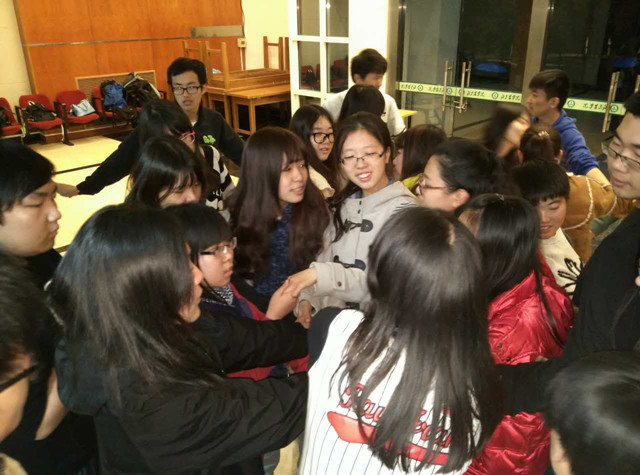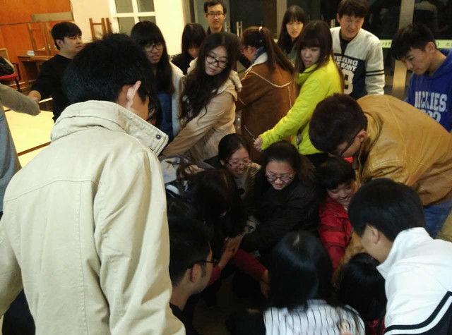 第三个环节,刘旭老师让同学们们围成一个大圈,手拉手,闭着眼睛往不同方向走,然后平移着往圆心走去,在这个过程中要一直拉住刚才自己所拉住的人。这时不同的胳膊缠绕在一起。刘老师告诉我们,这个结一定能解开。同学们尝试了各种方法,每个人都给出自己的意见,虽然在规定的时间内没能解开,但全班同学都感受到了团结的力量。