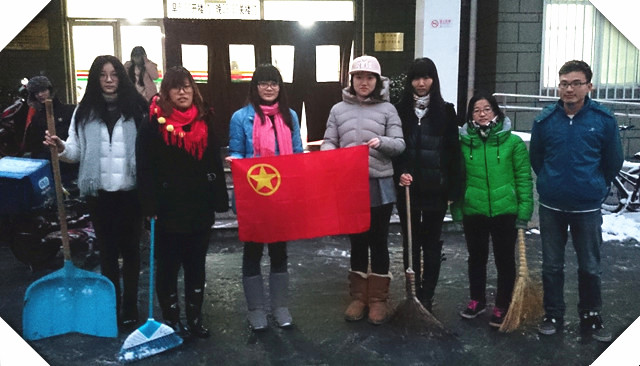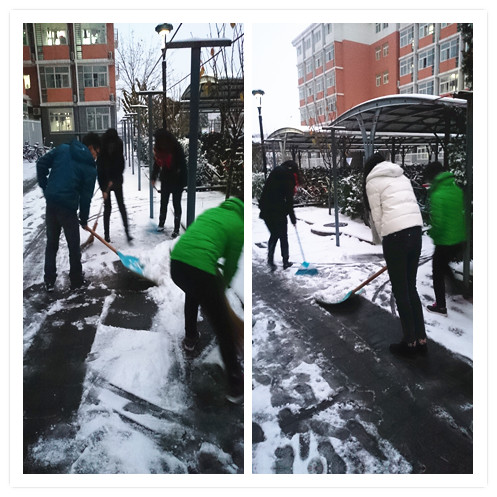 同学们冒着寒风,纷纷拿起铁锹、扫帚等工具组建扫雪队伍。大家不畏严寒,积极主动、相互配合、齐心协力,挥舞着铁锹和笤帚,你铲我扫,一派热火朝天的景象。尽管大家的脸都冻得通红通红,但手中的扫雪工具却不停地挥舞着,一点点地将积雪和冰层铲起集中堆放。经过一个多小时的辛勤劳动,动科志愿者们将八九号宿舍楼门口的积雪清扫干净,使同学们在平安出入宿舍的时候增添了一份好心情。