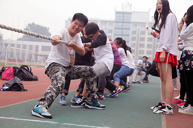 一声哨响,比赛开始了。两边队员都整齐地往后倒、向后退,看来都预练了多次。男生个个都涨得面红耳赤,青筋爆粗;女生也毫不示弱,放下了平时的淑女风范,使尽浑身力气将绳拉向自己一方。绳中间的红旗砝码也成了墙头草,在两边倒来倒去,比赛异常激烈。每班除了参赛队员以外,其他同学都自动组成拉拉队为本班加油。拉拉队竭力大叫“加油”,在气势上也力求压住对方,大有火上浇油之势,一点也不比队员轻松。他们冲着队员大喊,手臂指挥他们向后退,好像在隔空传功,“一二三,加油!一二三,加油!”在这震破苍穹的气势下,本班队伍往往能够把绳向后拖一点。这次比赛精彩纷呈,各队实力相当,此时拼的就是团结了,团结就是力量!经过多场鏖战,15动医2班最终获得冠军,祝贺他们,这是属于集体的荣耀!希望2015级动科新生们能把这种势头带到学习中去,再创辉煌!