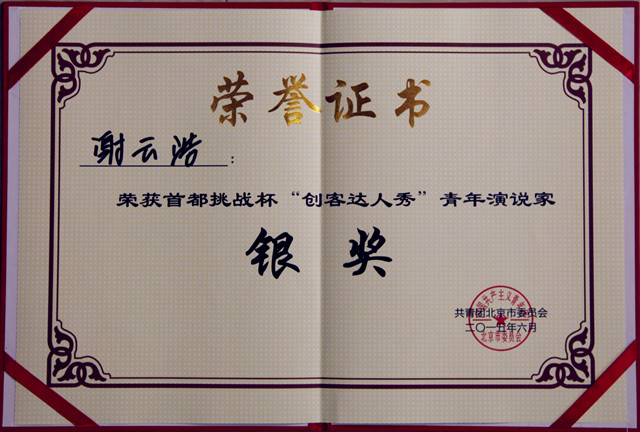 谢云浩同学获得首都挑战杯“创客达人秀”青年演说家银奖