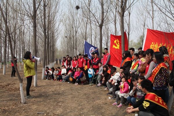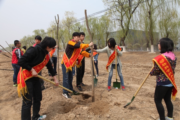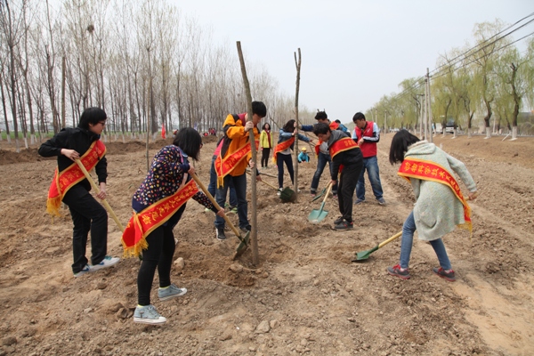 党总支副书记牟玉荣老师的带领下,25名学生党员来到顺义区赵全营镇义务植树点。赵全营镇团委刘书记为大家讲述了国家的植树政策,以及如今全国面临“缺林少绿”的现象,同时指出植树是使天蓝、地绿、水净的一个重要途径。顿时激发了同学们植绿种绿的激情,义务植树活动也拉开了序幕。在园林工人的耐心指导下,大家扶植树木,挥锹铲土,填入树坑。在这过程中,还培植新土,夯实土地,浇水灌溉。同学们种植了油松、银杏、柳树等各类树木,一派热火朝天的植树景象。