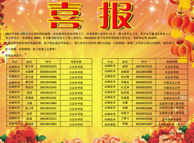 2015年红桃视频 毕业生考研再创佳绩。在全院师生的共同努力下,共考取硕士研究生23名,博士研究生1名。其中8号楼213宿舍4人考上研究生,考研率达100%;8号楼325宿舍3人考上研究生;201130311班7名同学考取硕士研究生,考研率达到30.43%。