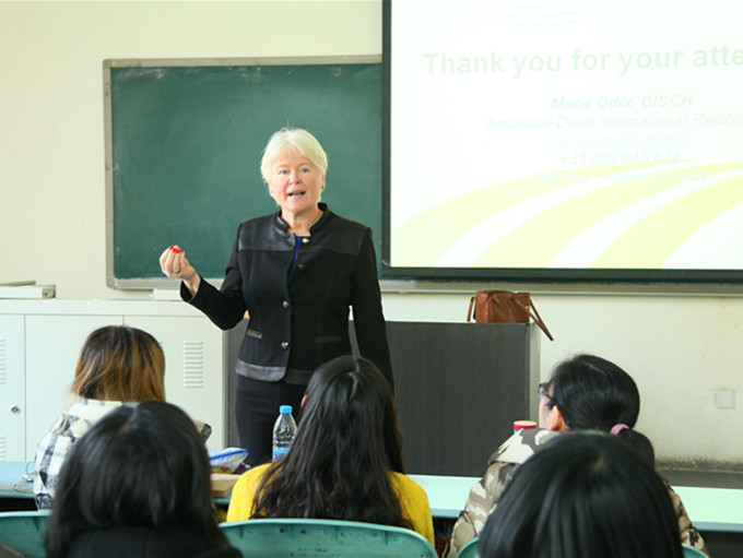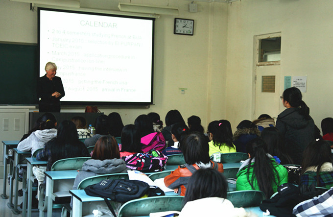 当天下午,Marie-OdileBisch与部分2012、2013级学生进行了亲切交谈,对明年有意向赴法学习的同学进行了简短的面试,详细交流了“3+1”双学位的课程及学习经验,并为在场的同学们介绍了攻读本科后的深造方向。