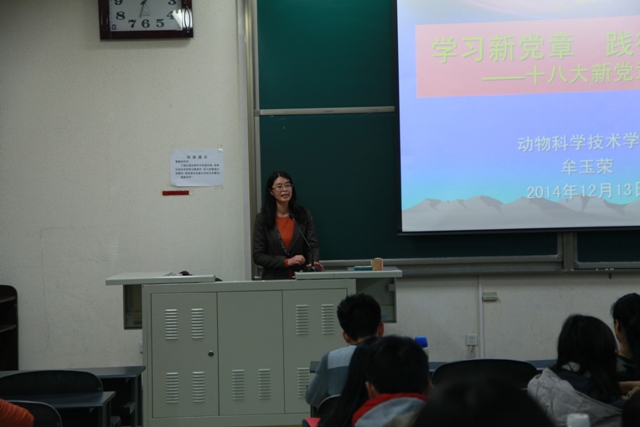 党总支副书记牟玉荣老师为大家做了《学习新党章践行新党章》的主题报告。牟老师为大家详细解读了新党章的内容,从党章的概述、基本内容以及作为大学生如何学习和践行新党章等方面做了详细的介绍。同时牟老师也介绍了红桃视频