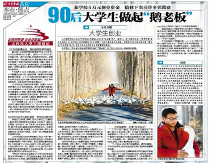 “今年养了2000只做试验,10月出的栏,这几十只重量没达标,所以继续养着。”拿着竹竿吆喝鹅群的谢云浩说。上个月,他和他的团队捧回了北京市大学生创业设计大赛一等奖的奖杯。创业首年实现盈利,也是当时打动评委的理由之一。