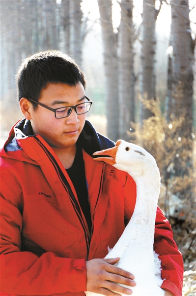 动物医学专业大三学生,大兴区北章客村的“土著”。全村共170多户人家,只有谢云浩一家不住村里,而把家安在田间。用谢妈妈的话说,“西边挨永定河,屋前屋后有树,像在世外桃源。”地铁天宫院站往西南,沿着小道经10分钟车程,三间红砖平房赫然醒目,这里便是谢云浩家。没等记者走近,散养在林带里的白鹅嘎嘎叫声此起彼伏。