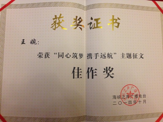 学生王婉在“同心筑梦携手远航”两岸征文活动中获奖