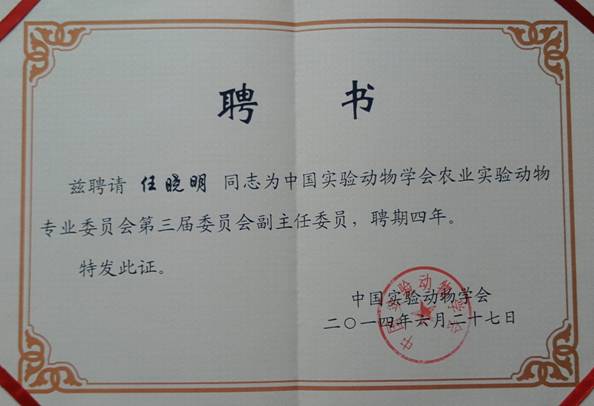 中国实验动物学会第十一届年会于2014年6月26—28日在重庆召开。期间进行了学会专业委员会改选。红桃视频 任晓明教授被聘为中国实验动物学会第三届农业实验动物专业委员会副主任委员。