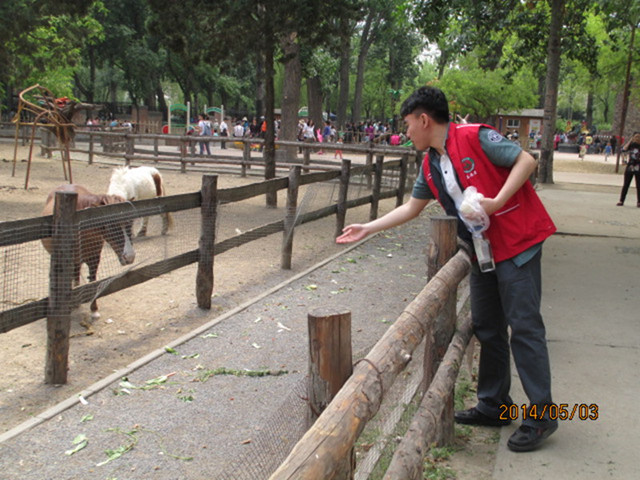 2014年5月1日-3日,共有22名同学参与到动物园志愿服务活动中。在三天的志愿活动中,志愿者们在动物园工作人员的指导下,对儿童乐园、大象馆和长颈鹿馆的游客进行引导和帮助,并倡导游客文明投喂、文明游园。