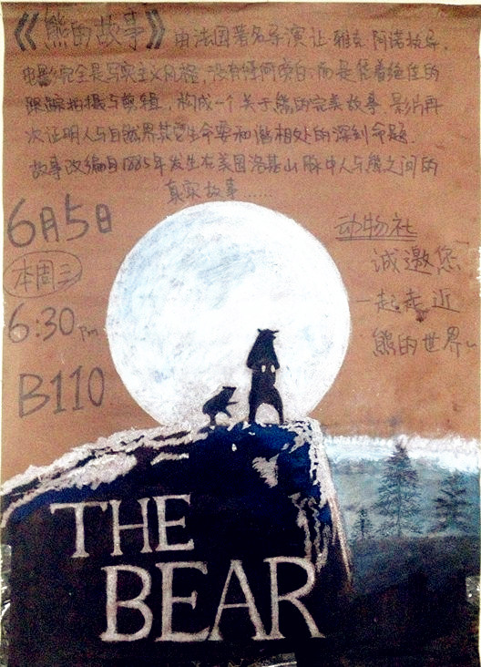动物社为宣传“人与自然和谐相处”的思想,于教学楼B座110开展第三届宠物文化节之《熊的故事》电影放映活动。