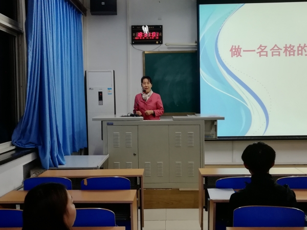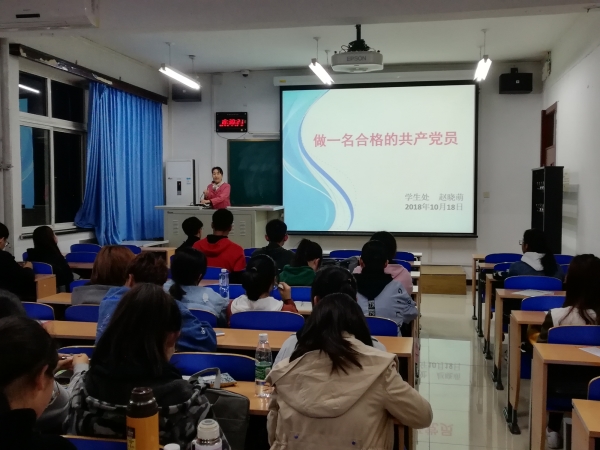 学生处副处长赵晓萌老师从如何做一名合格的共产党员给同学们提出了具体要求和列出了身边的榜样——市级优秀党员谢云浩同学。