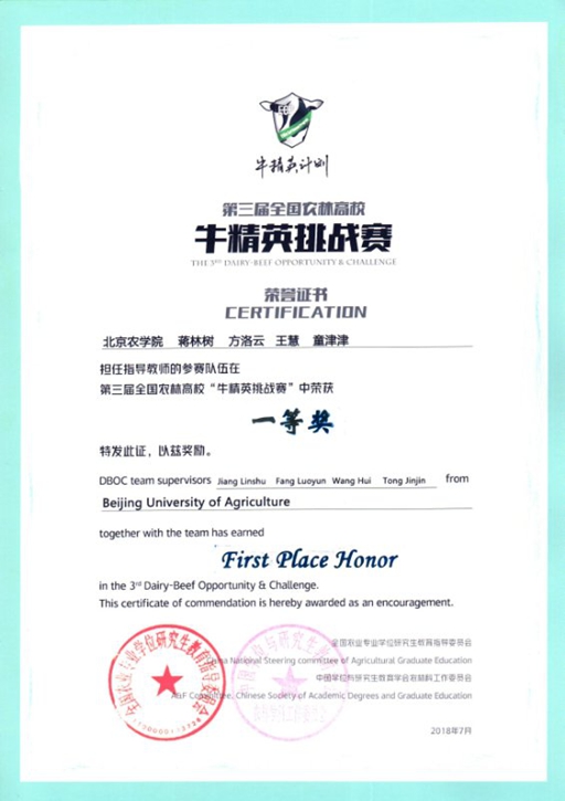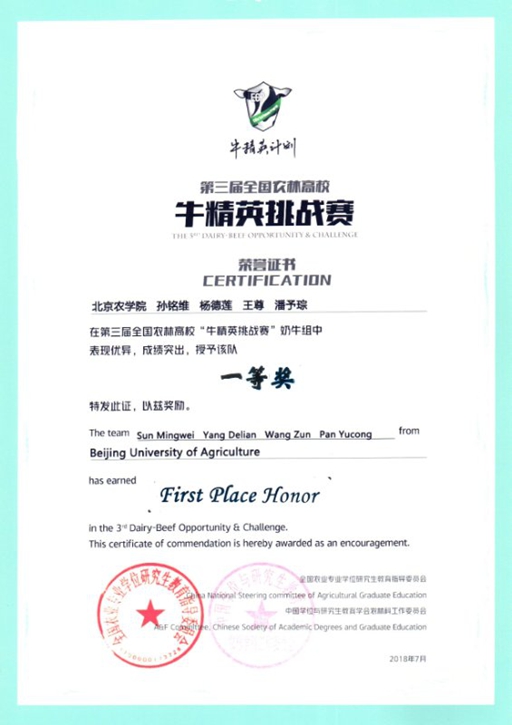 本科生潘予琮、王尊组成,经过前期的刻苦训练,赛场的奋力拼搏,最终荣获第三届全国农林高校“牛精英挑战赛”奶牛组一等奖。