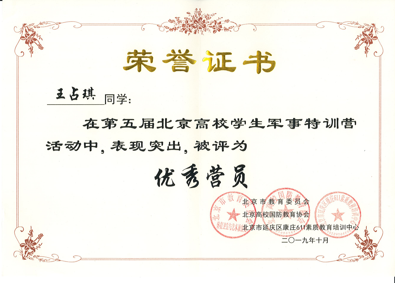 王占琪同学被评为“第五届北京高校学生军事特训营优秀营员”。