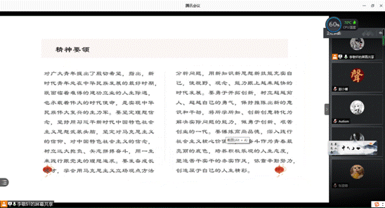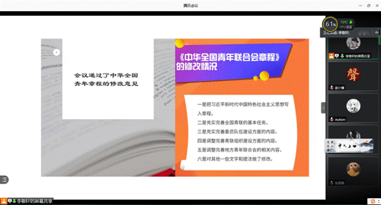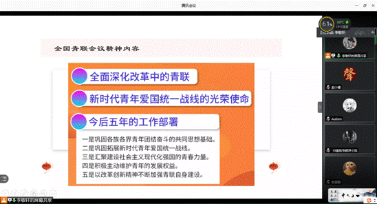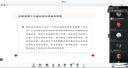 活动伊始,主持人介绍了全国青联十三届全委会审议的基本情况以及其精神内容,分为三个方面:全面深化改革中的青联、新时代青年爱国统一战线的光荣使命以及今后五年的工作部署。会议指出,今后五年,各级青联组织要切实巩固各族各界青年的共同思想基础,把学习宣传贯彻习近平新时代中国特色社会主义思想作为首要政治任务,巩固扩展新时代青年爱国统一战线,汇聚建设社会主义现代化强国的青春力量,积极主动维护青年的发展权益,以改革创新精神不断加强自身建设。