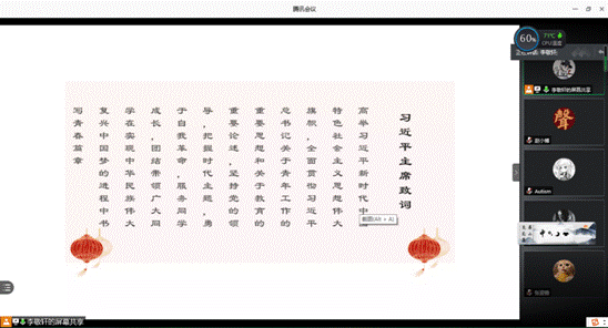 活动最末,以习近平主席的致词作为结尾,身为新时代青年应高举习近平新时代中国特色社会主义思想伟大旗帜,全面贯彻习近平总书记关于青年工作的重要思想和关于教育的重要论述,坚持党的领导,把握时代主题,勇于自我革命,服务同学成长,团结带领广大同学在实现中华民族伟大复兴中国梦的进程中书写青春篇章。