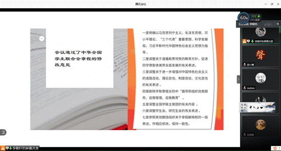 随后介绍学习全国学联二十七大对于学联会章程的修改意见以及精神要领,本次大会指出,新时代青年承载着伟大的时代使命,是实现中华民族伟大复兴的生力军。身为新时代青年应坚定理想信念,坚持用习近平新时代中国特色社会主义思想武装头脑,坚定对马克思主义的信仰、对中国特色社会主义的信念,树立远大抱负,勇于开拓创新,树立超越前人、超越自己的勇气,将所学所知转化为解决实际问题的能力,积极培养乐观的人生态度,塑造苦干实干的务实作风,依靠辛勤努力,创造属于自己的精彩人生,做艰苦创业的一代青年。