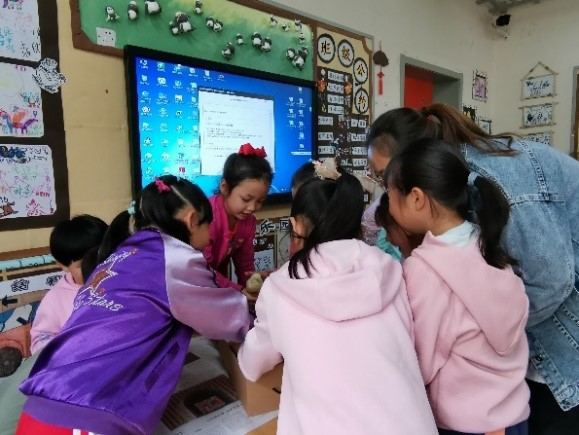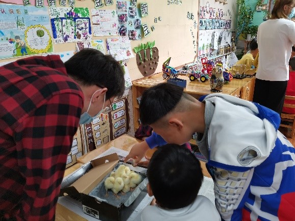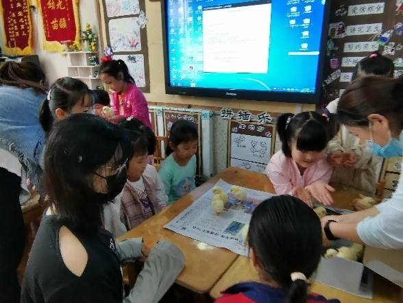 接下来为互动环节,学生党员将雏鸡分发给幼儿园小朋友们,进一步深入了解雏鸡形态特征和生活习性。