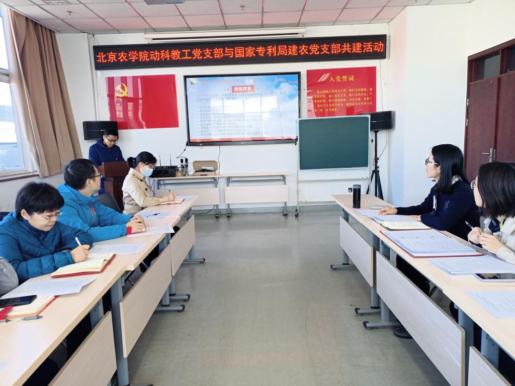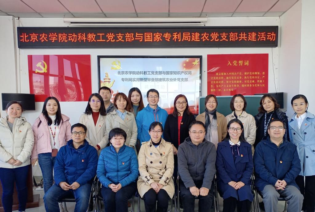 党总支书记党登峰,国家知识产权局专利局实用新型审查部建筑农业处党支部组织委员王晓宁、宣传委员李硕,动科教工党支部书记李艳玲、组织委员盛熙辉、宣传委员曹素英及两支部全体党员参加了此次共建活动。