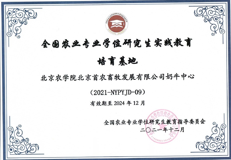 -北京首农畜牧发展有限公司奶牛中心”荣获全国农业专业学位研究生实践教育培育基地称号。