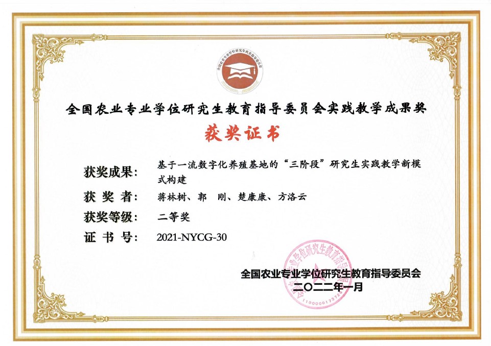 蒋林树教授团队成果《基于一流数字化养殖基地的“三阶段”研究生实践教学新模式构建》荣获二等奖。