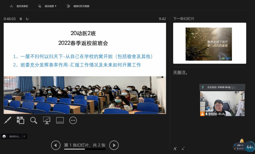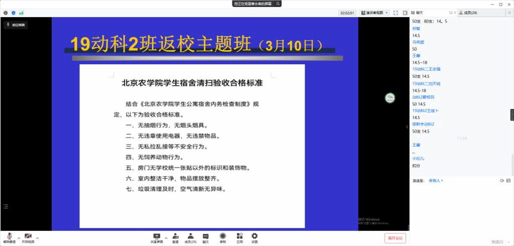 此次线上主题班会的顺利召开,提高了同学们的疫情防控意识,加强了线上学风建设,帮助同学们尽快调整好状态,为新学期各项工作的顺利开展打下良好的基础。