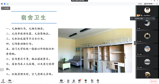学生宿舍清扫验收合格的八个标准和疫情防控注意事项等,进行了提醒和讨论。通过本次班会,各个班级明确了目标,掌握了具体的标准,落实了行动的细节,也增强了班级的凝聚力。