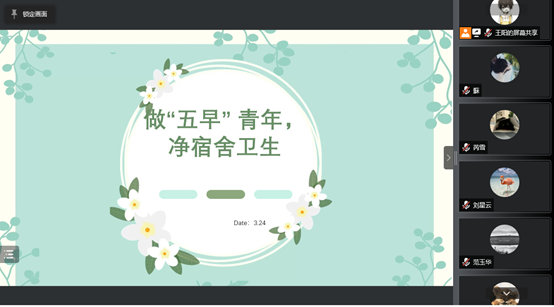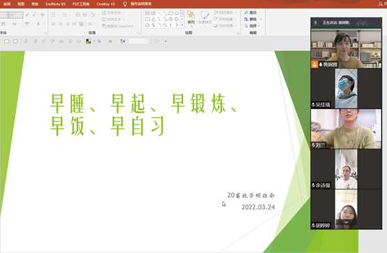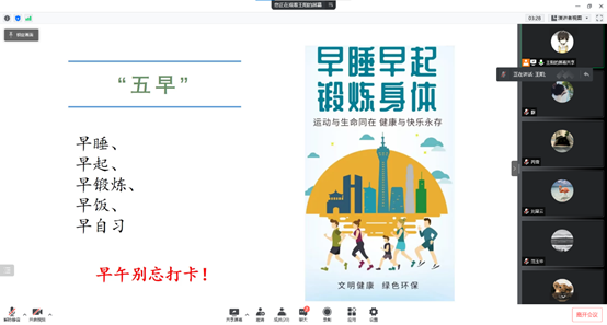10个研究生班级召开了以“五早”(早睡、早起、早锻炼、早饭、早自习)为主题的班团会。班会采取线上和线下相结合的方式进行,红桃视频