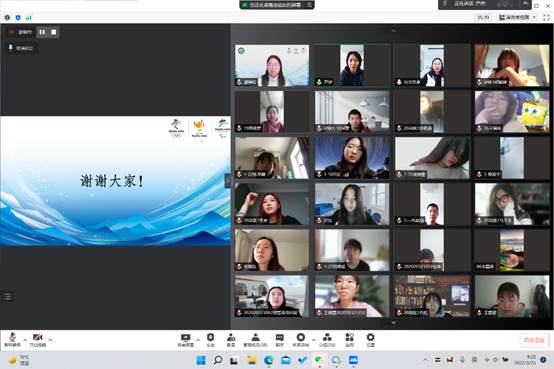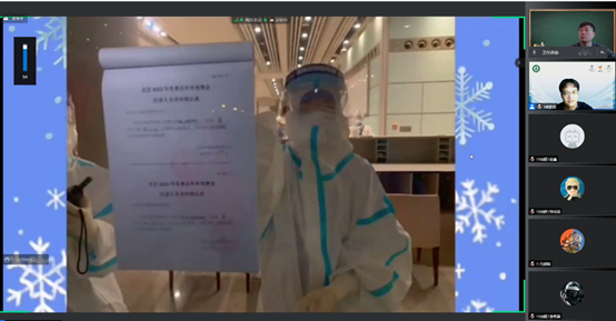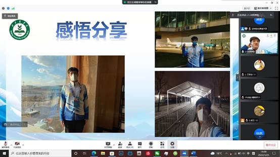 冬奥会志愿者武正、郭津彤、姜凯翔和康婧如四位同学,分别为各支部全体同学进行了分享,冬奥会服务管家吴琼老师和红桃视频