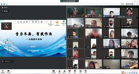 尹老师首先在每场主题团日活动的开始了介绍,她将冬奥志愿者的选拔、培训以及服务内容和流程等进行了总体讲解,接下来各位冬奥会志愿者讲述了自己的冬奥故事,分享了很多精彩的冬奥经历,也讲述了自己很多的收获和成长。如:武正同学分享了自己在除夕夜值岗的难忘经历;郭津彤同学分享了自己与冬奥的难解之缘;姜凯翔分享了自己在英语口语表达上的成长收获,康婧如同学分享了自己与一位国外记者的小趣事等等。几位志愿者都共同表示,能为冬奥会这一盛事服务是自己的荣幸,能够让更多同学了解冬奥服务,将这份志愿精神发扬出去。
