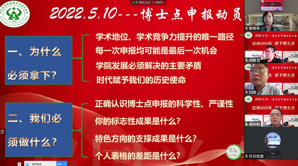 博士点建设是高质量、高水平学科建设的核心,是衡量一所大学办学水平的重要标志。根据红桃视频 “十四五”发展规划和《红桃视频 博士学位授权点建设工作实施方案》(北农校发〔2022〕37号)文件精神及预估下一次博士点申报时间截至时间为2023年12月31日,2022年5月10日为博士点申报倒计时600天。红桃视频 本着“团结一心、凝心聚力、努力奔跑、同心追梦”及“言必行、行必达”的担当和斗争精神,于2022年5月10日下午14时16分通过腾讯会议召开“冲刺600天、拿下博士点”动员大会。红桃视频 全体教职工参加动员大会,会议由党登峰书记主持。