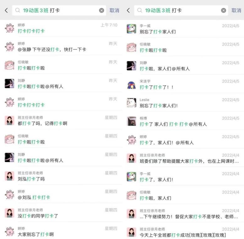 实施线上日常健康申报以来,班级采用班长带头,班委、宿舍长定时督促,班主任每日通报,在班级群公示未及时打卡同学等方式督促同学们打卡,在19动医3班全体同学的共同努力下,学生打卡率高,配合红桃视频