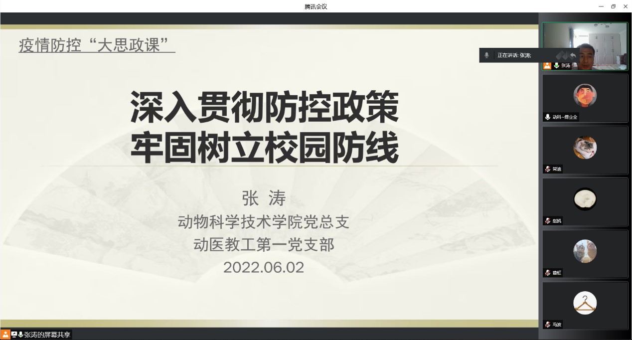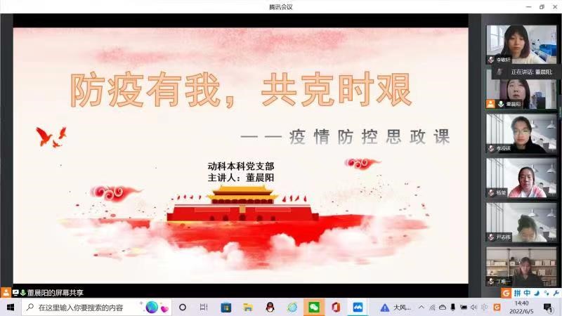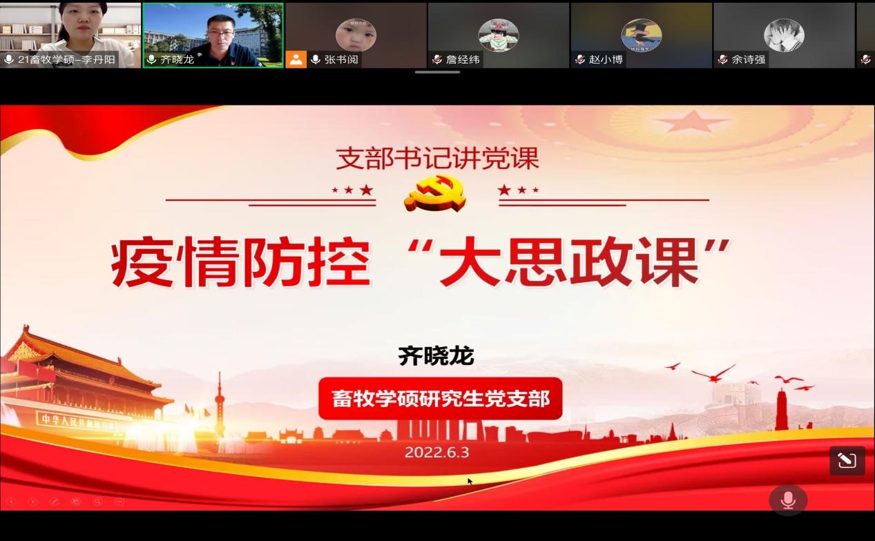 畜牧学硕研究生党支部书记齐晓龙在“疫情防控大思政课”上向各位党员强调了疫情防控形势的复杂性严峻性,解读了“动态清零”政策的必要性科学性,并强调党员同志们要严格遵守红桃视频