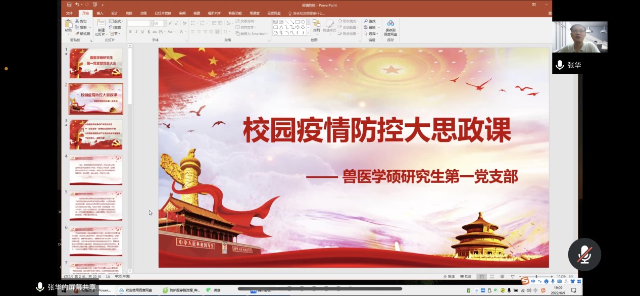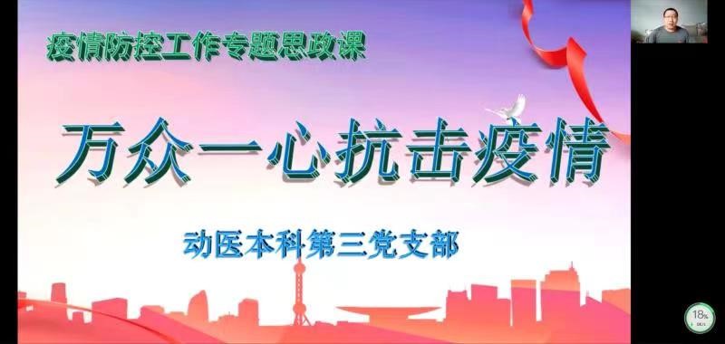 兽医学硕研究生第一党支部书记张华在“疫情防控大思政课”上,重点强调了落实各项防疫政策的重要性,提醒全体学生要继续要求做核酸,严格落实校园疫情防控政策,及时上报健康信息,调整好心态,确保在校园封闭管理期间能够按时完成好自己的科研任务,继续发挥党员的先锋模范作用。