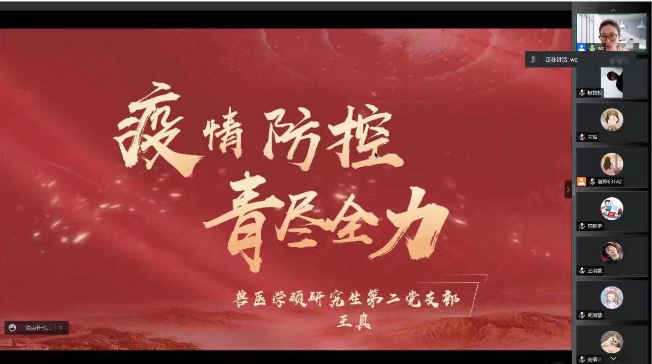 兽医学硕研究生第二党支部书记王真以“疫情防控,青尽全力”为主题,为支部党员讲述了现在的国内外疫情形势,强调现阶段疫情形势的的复杂性及严峻性,进一步解读了国内的防控政策和校内的防控政策,同时要求各位党员落实好各项防疫规定,发挥党员的先锋模范作用。
