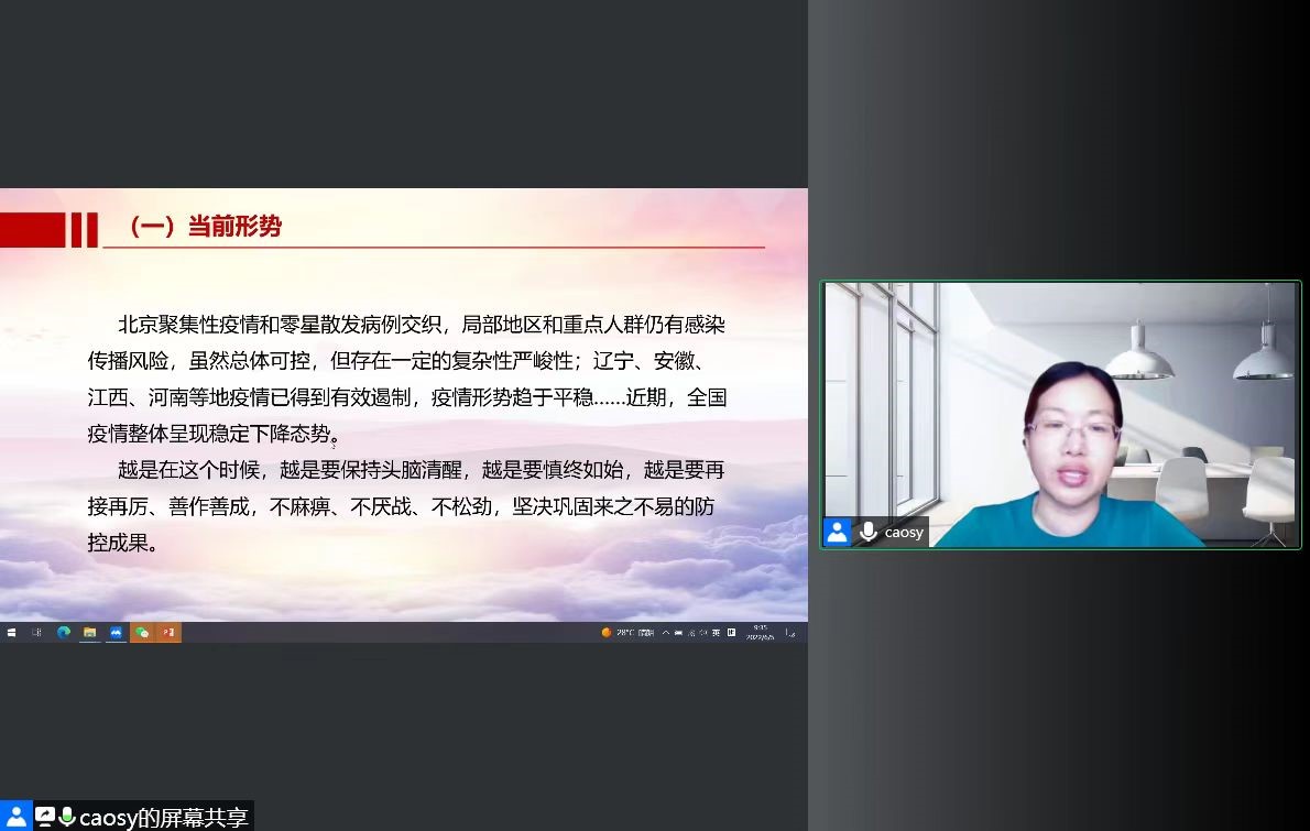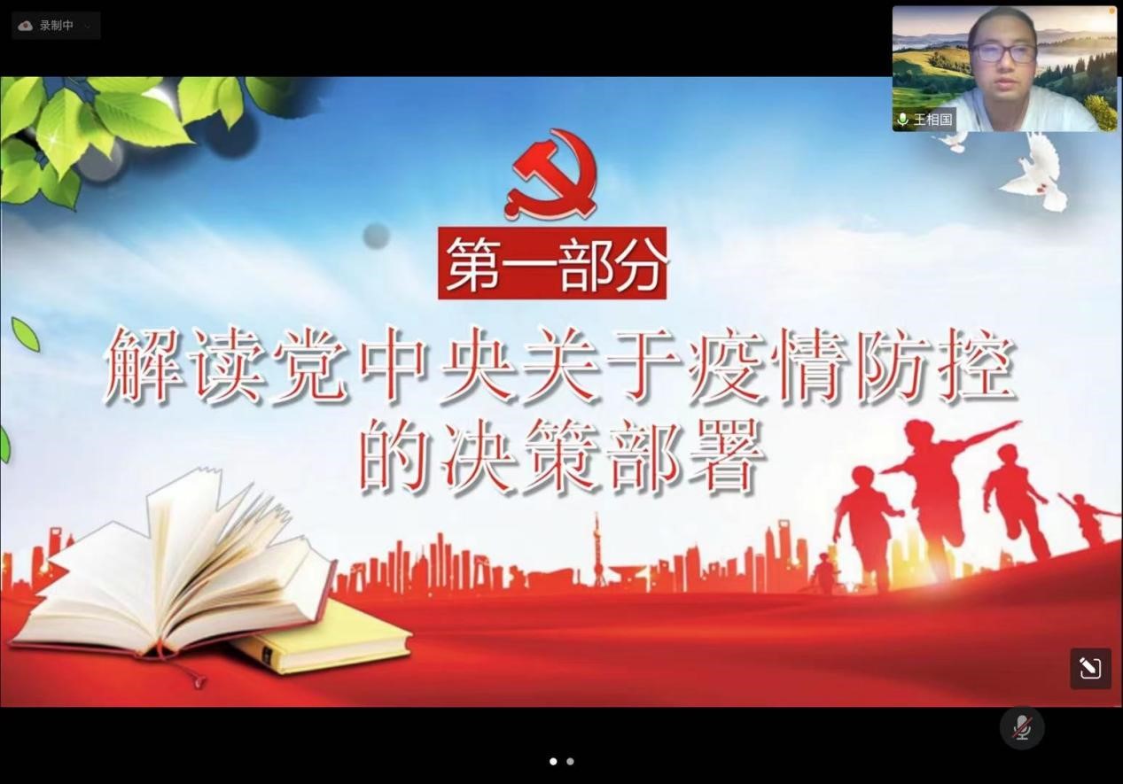 动医教工第二党支部书记侯晓林在“疫情防控大思政课”上为支部党员教师解读了中共中央就疫情防控工作的相关部署,分析了“动态清零”总方针,强调了北京市及红桃视频