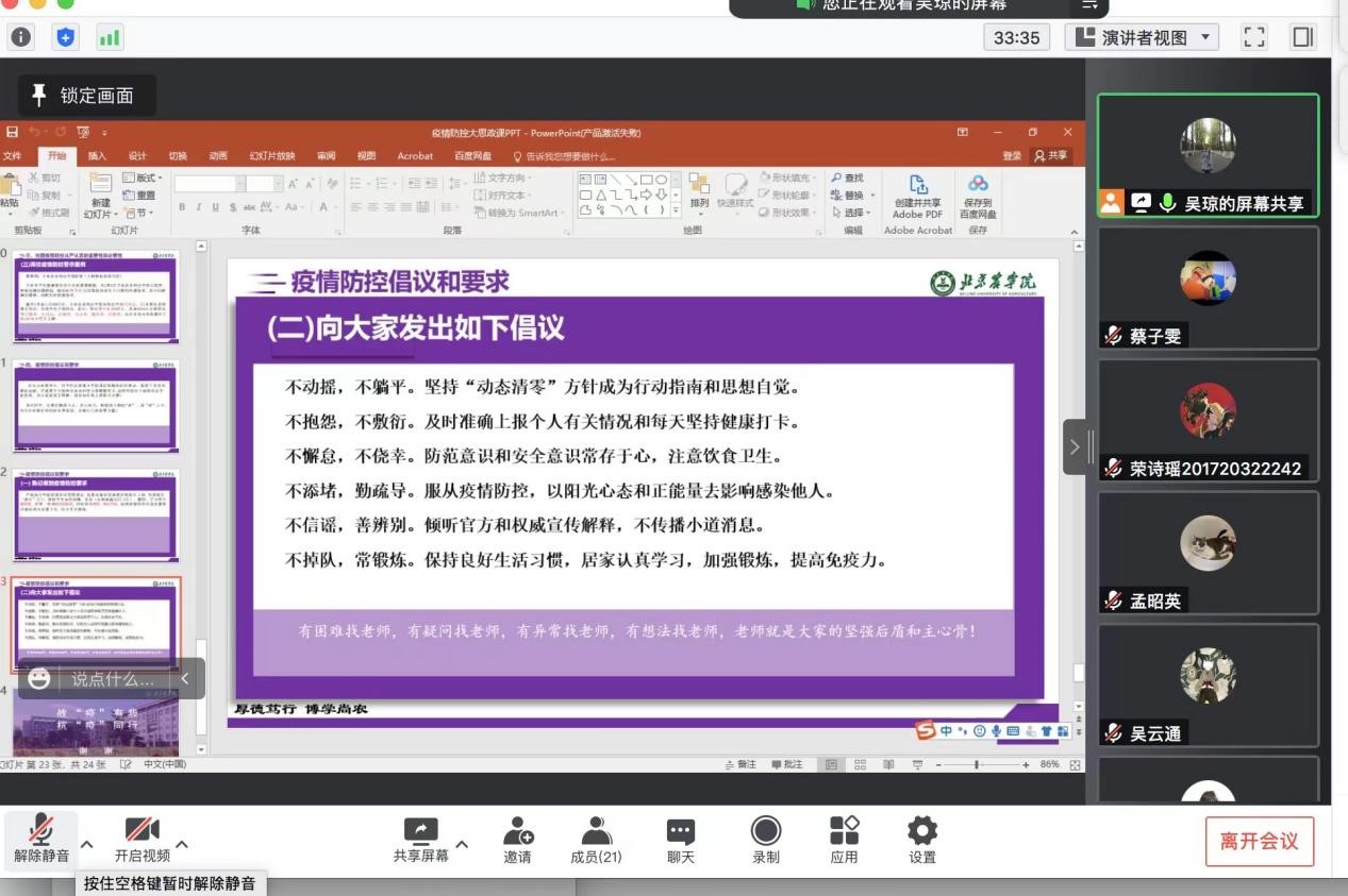 动医本科第二党支部书记吴琼以“凝心聚力抗击疫情”为主题,强调了此次北京疫情形式的严峻性、复杂性,深入分析了坚持“动态清零”的必要性和科学性,要求各位党员在开展线上学习时也仍然要注意自身安全,做好疫情防护,尽量不要去人员密集的地点,严格遵守各项规定。
