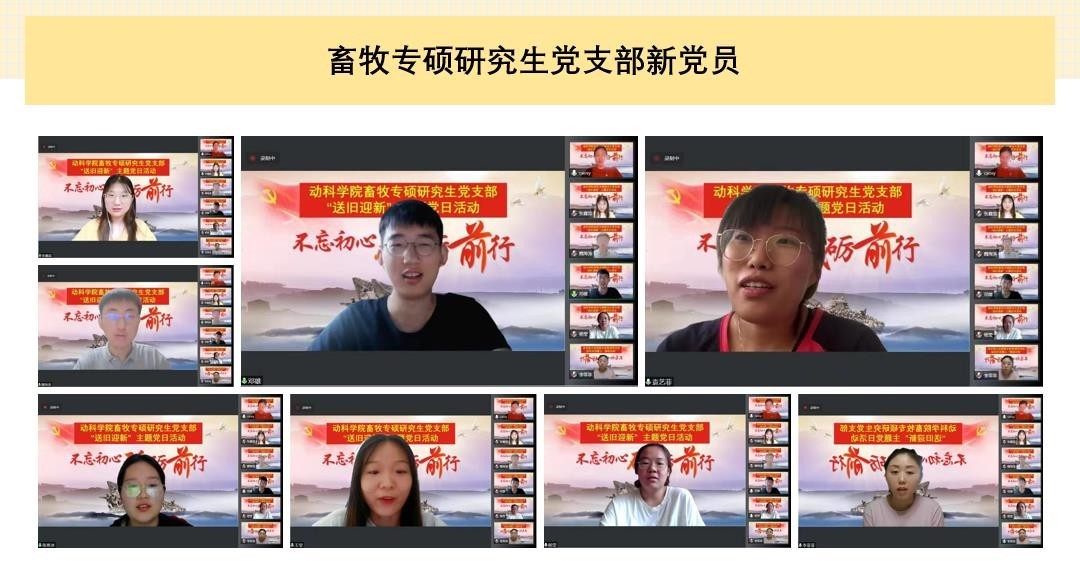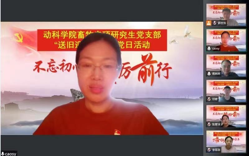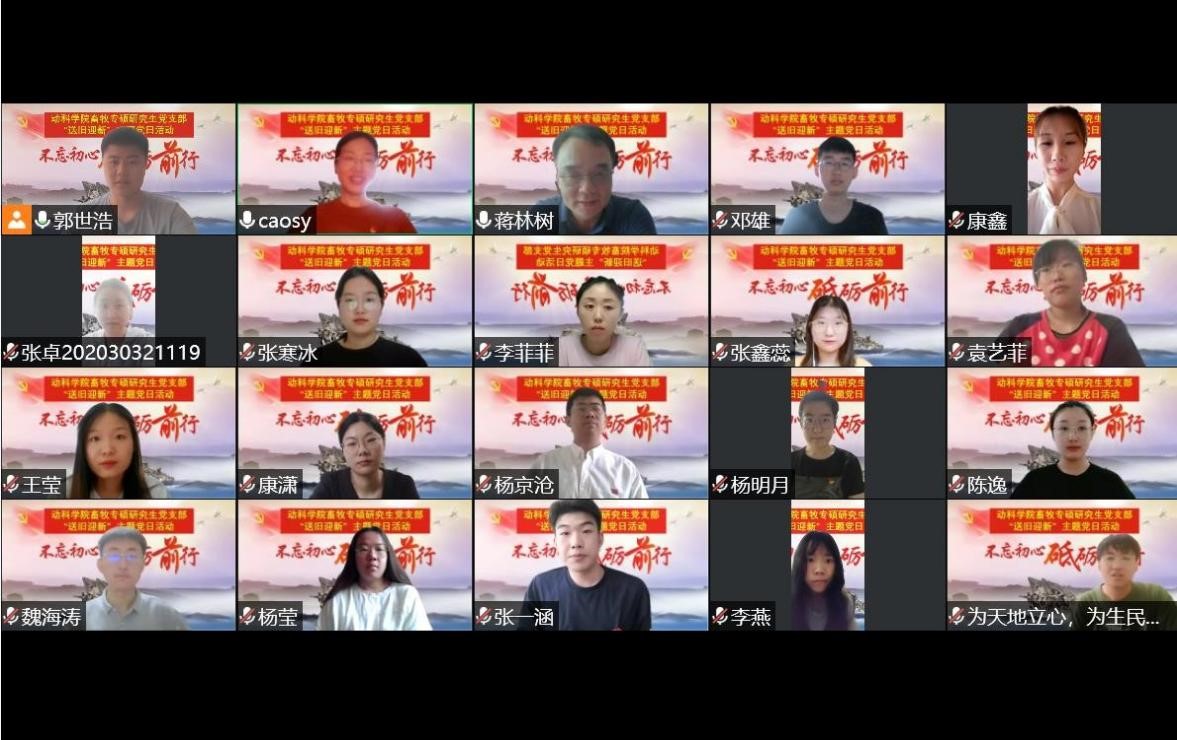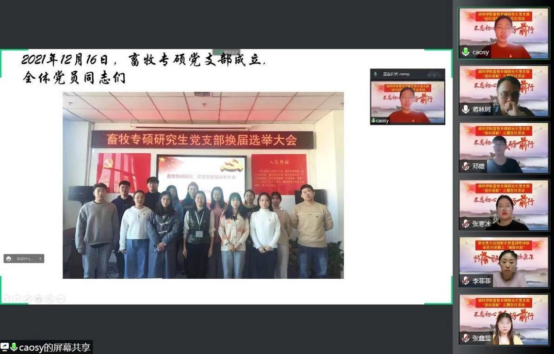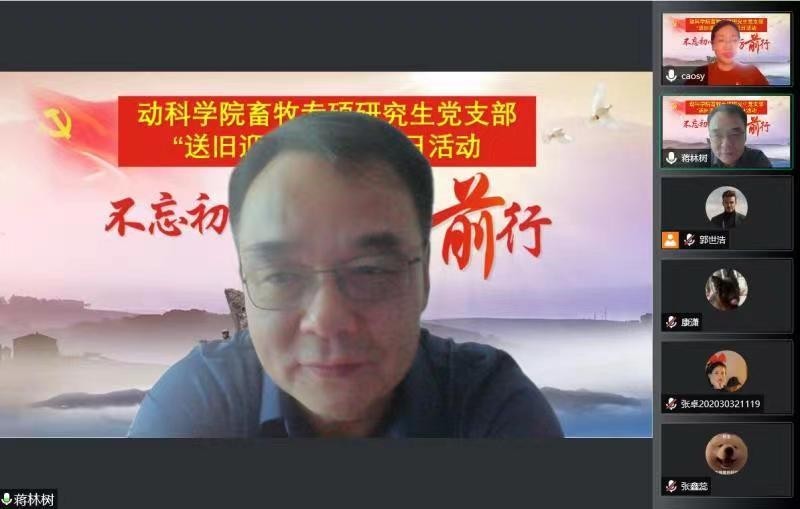 畜牧专硕研究生党支部线上开展主题党日活动,会议由支部书记曹素英主持,会议议程包括支部书记曹素英介绍支部情况、汇报支部上半年工作以及下半年的工作计划、院长寄语、新生党员自我介绍及毕业生党员经验分享等。活动特邀学院党总支副书记、院长蒋林树参加。