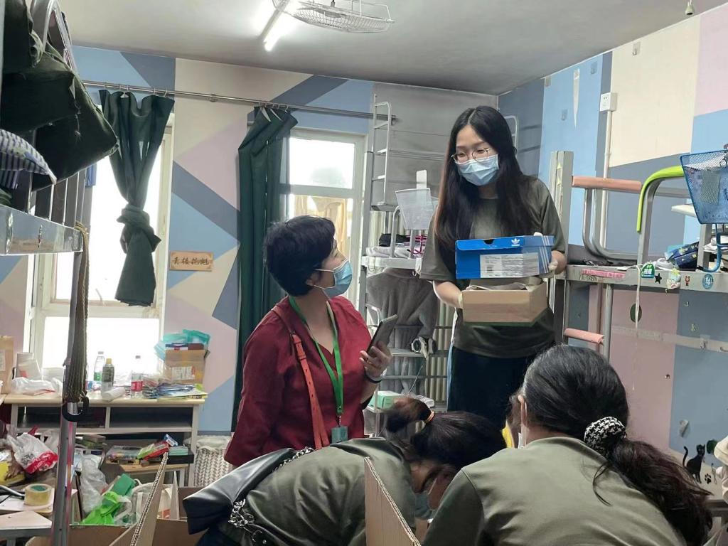 一手举着手机,一手整理物品,老师们全程与学生视频连线,由学生“导航”,精准“定位”每一件物品。确保把每一位毕业生的物品完整、有序地整理好、打包好、邮寄好。