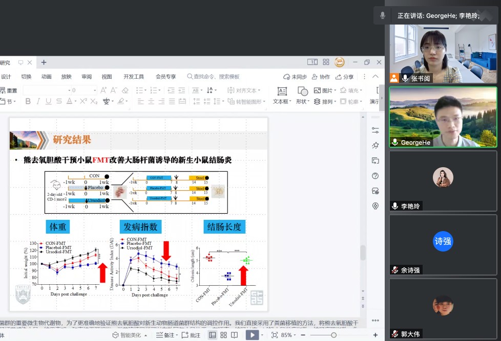 研究生张书阅主持。论坛邀请中国农业大学博士后何至远做题目为《肠道菌群和奶牛消化道疾病的相关性》的报告,中国农科院刘大鹏博士做题目为《鸭肉风味品质遗传基础研究》的报告。论坛最后,硕士研究生安红、盖凯以及郭大伟3名同学分别做了课题汇报。