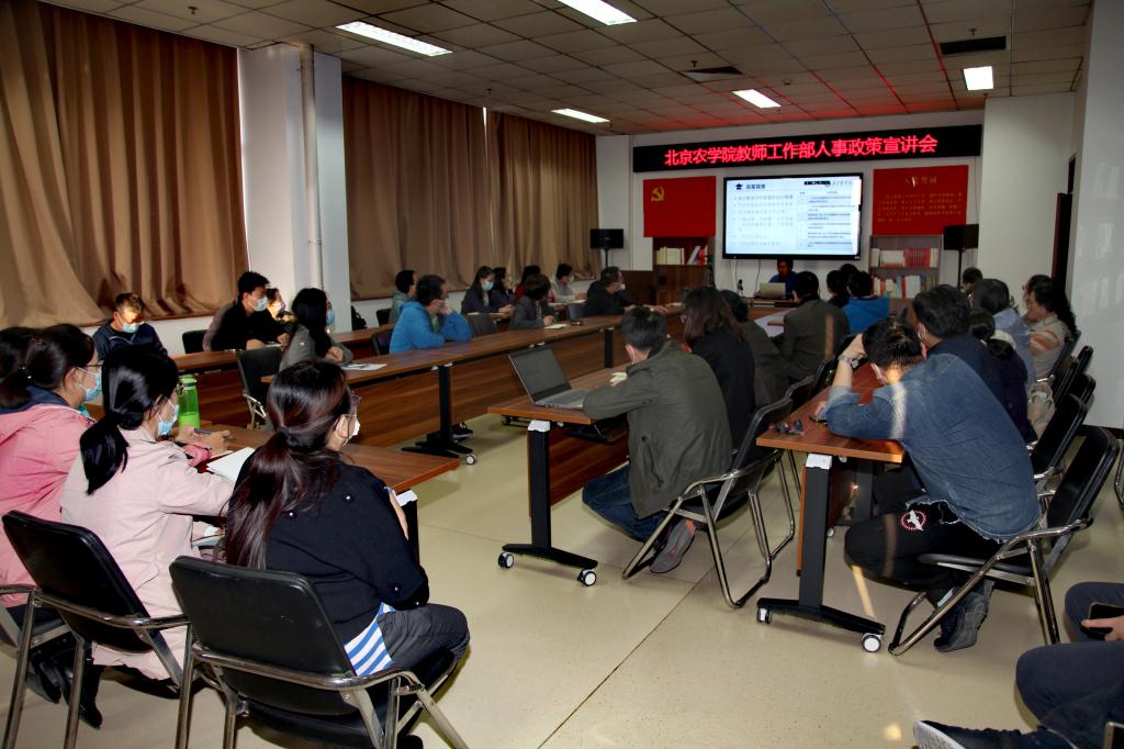 召开全体教职工大会,邀请党委教师工作部部长、人事处处长刘铁军做人事政策宣讲,会议由院长蒋林树主持。
