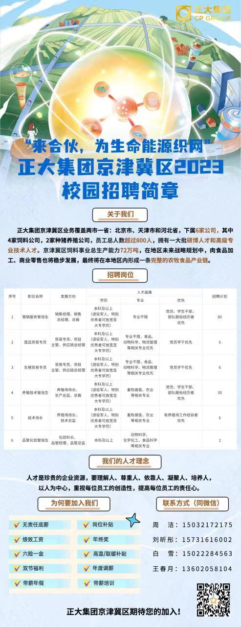 此次招聘会主要是面向2023届本硕毕业生提供京津冀区的工作岗位。正大集团京津冀区业务覆盖两市一省:北京市、天津市和河北省,下属6家公司,其中4家饲料公司,2家种猪养殖公司,总投资约5亿人民币,目前拥有正式员工超过800人,拥有一大批硕博和高级专业技术人才。