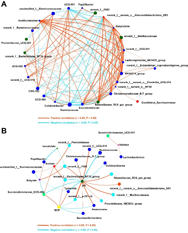 图2. 附着细菌与瘤胃发酵参数的相关性网络分析