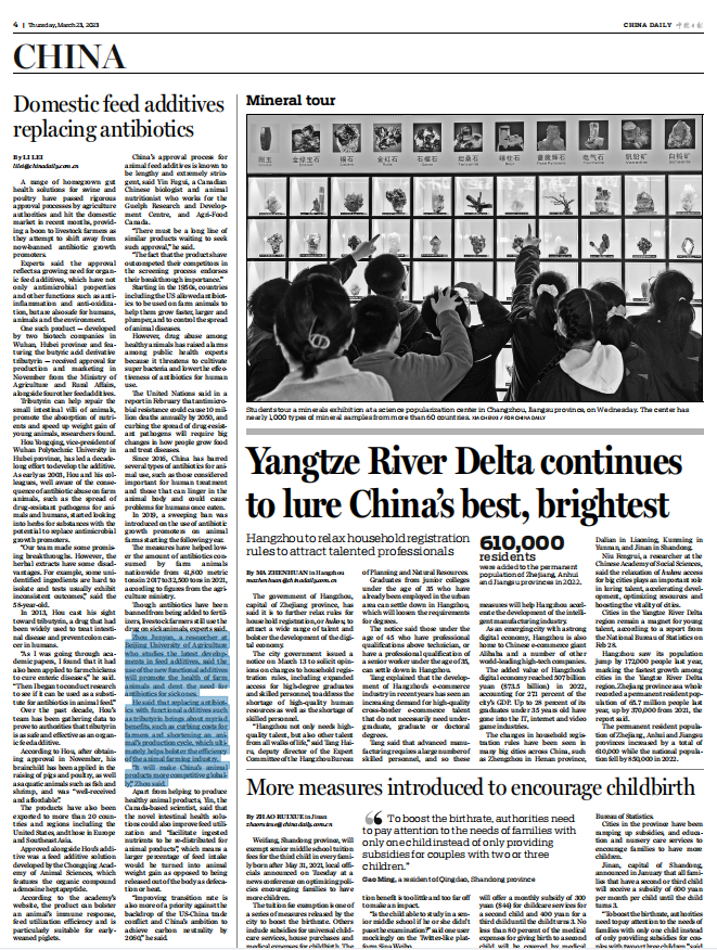 One such product — developed by two biotech companies in Wuhan, Hubei province and featuring the butyric acid derivative tributyrin — received approval for production and marketing in November from the Ministry of Agriculture and Rural Affairs, alongside four other feed additives.