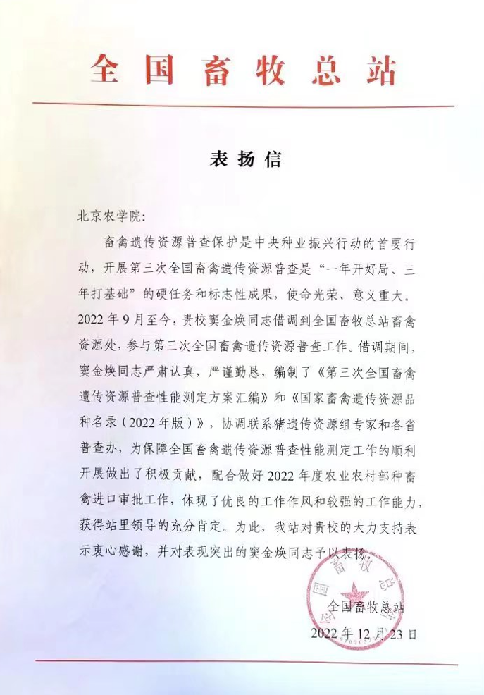 在表扬信中,全国畜牧总站称赞窦金焕同志在借调期间,编制了《第三次全国畜禽遗传资源普查性能测定方案汇编》和《国家畜禽遗传资源品种名录(2022年版)》,为保障全国畜禽遗传资源普查性能测定工作的顺利开展做出了积极贡献。全国畜牧总站称赞窦金焕同志表现突出,决定予以表扬。