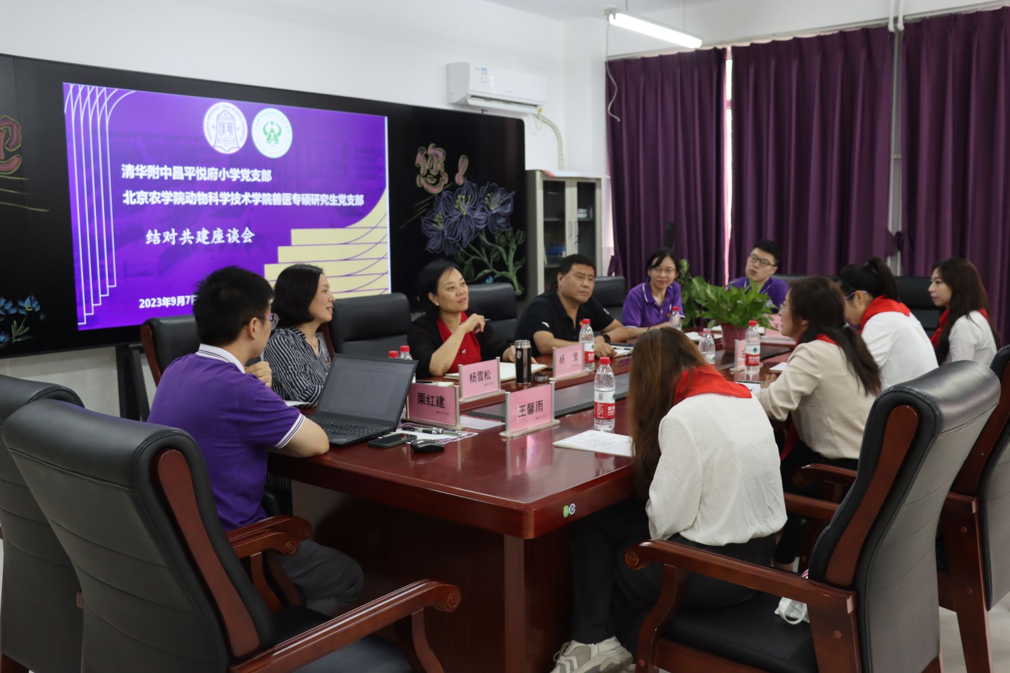 教学副院长姚华和兽医专硕研究生党支部书记王星星、组织委员李宁、宣传委员王馨雨一行到清华附中昌平悦府小学和悦府小学党支部开展结对共建活动。在悦府小学党支部书记杨莹、副校长杨雪松等老师的热情接待下,兽医专硕研究生党支部师生一行首先参观了校园环境和教学设施,随后在会议室开展了深入的交流座谈。