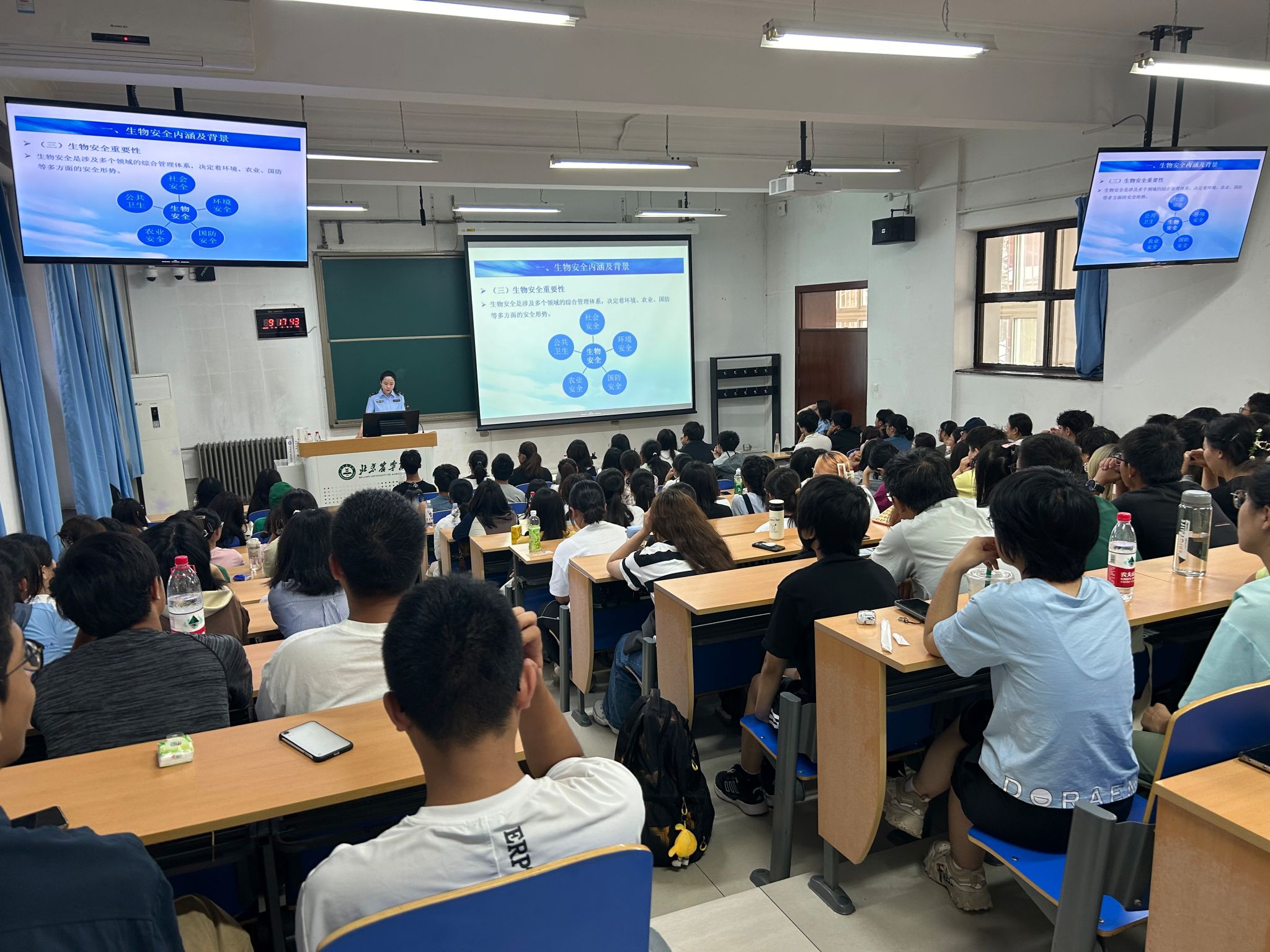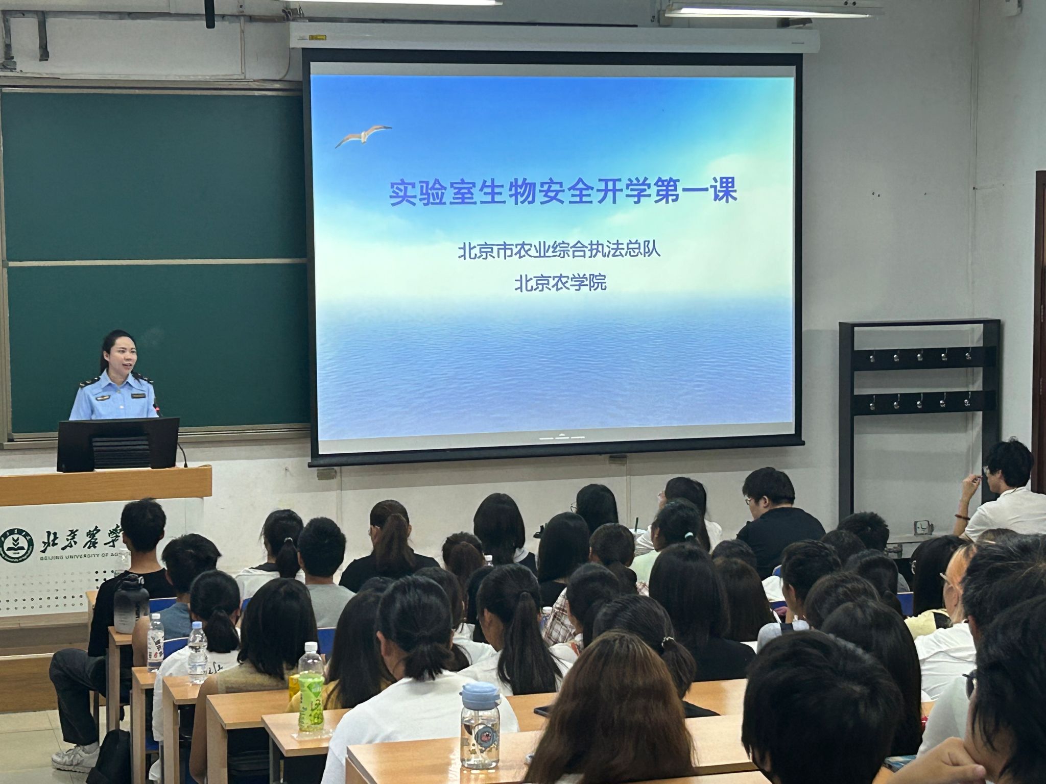 动物病原微生物实验室管理水平,严防公共生物安全事件的发生,9月15日,北京市农业综合执法总队动卫监督执法支队为2023级本科生讲授了生物安全第一课。
