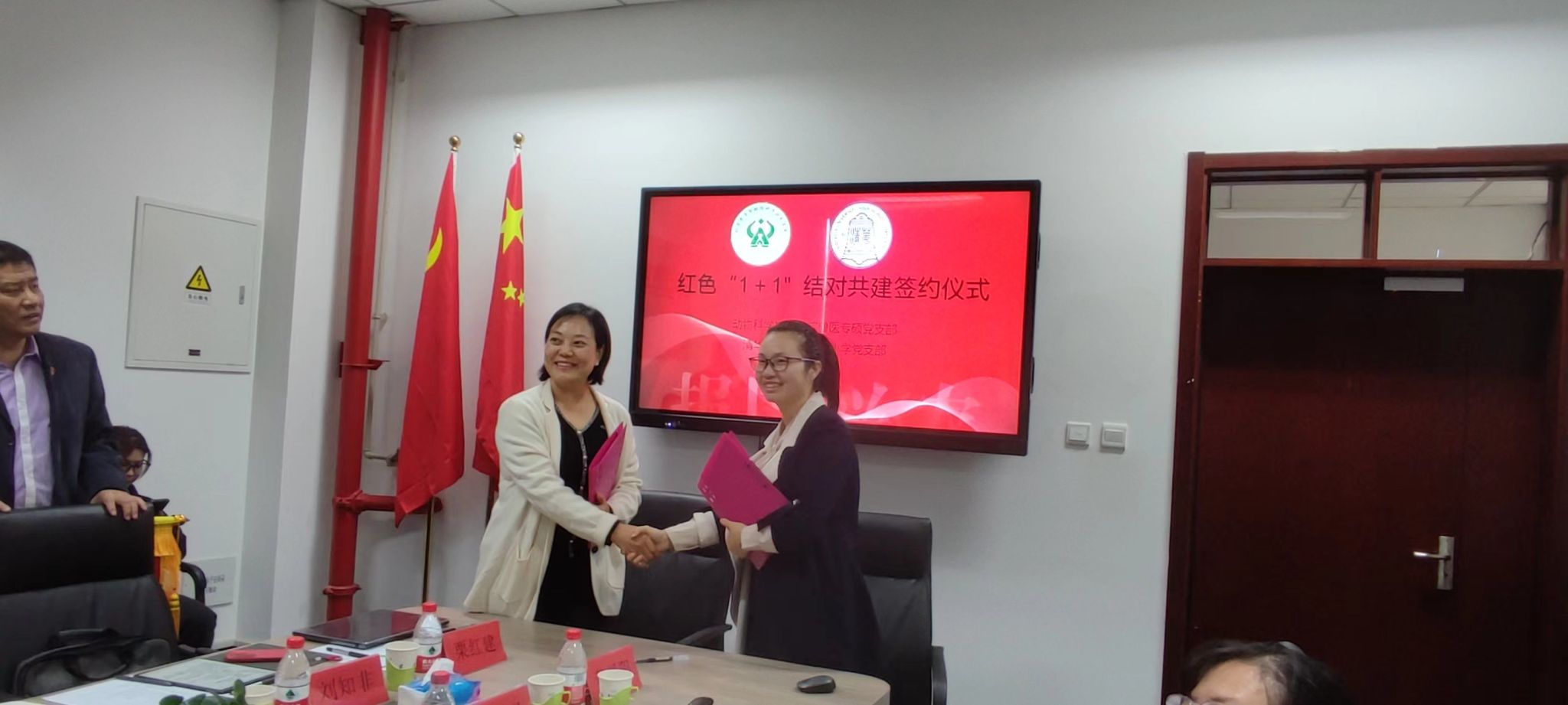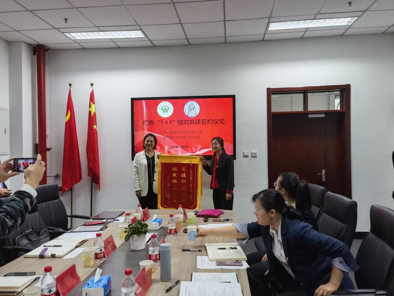 兽医专硕研究生党支部书记王星星与清华附中昌平悦府小学党支部书记杨莹共同签订了红色“1+1”共建协议。